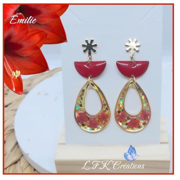 Émilie boucles colorées et dorées, fleurs séchées et acier inoxydable or (hypoallergéniques). 3 couleurs disponibles (vert, rouge, violet).
