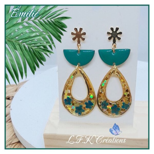 Émilie boucles vertes et or, fleurs séchées et acier inoxydable or (hypoallergéniques).